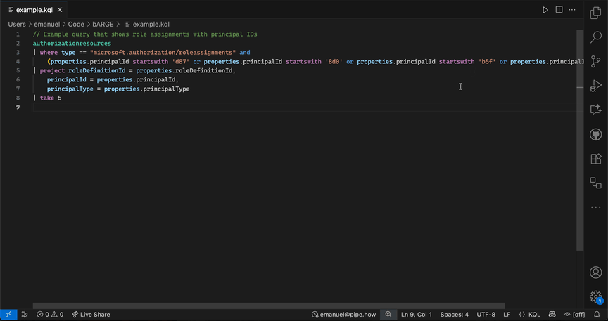 A tricky thing was to decide how best to implement the language support, since the only available language tooling is for all of KQL while ARG only supports a subset of it. Figuring out which parts to keep and which parts to exclude will be ongoing improvement.